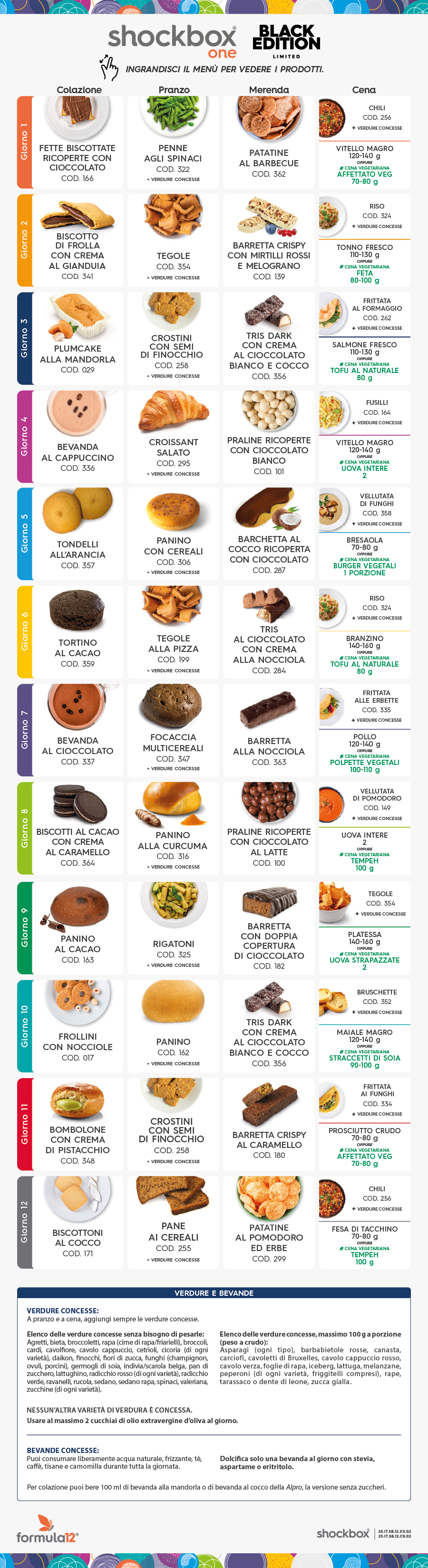 Non sappiamo neanche noi come facciamo a farci stare tutto! All’interno di Shockbox One Black trovi i prodotti per colazione, pranzo, merenda del pomeriggio e cena (se scelta al momento dell’acquisto). Basta aggiungere le verdure concesse e 2 cucchiai di olio extravergine al giorno. Il Team di Nutrizionisti ha realizzato un elenco di verdure concesse durante il percorso. Alcune verdure possono essere consumate senza necessità di essere pesate altre fino ad un massimo di 100 g. Le verdure contengono per natura zuccheri, alcune ne contengono un quantitativo superiore, non compatibile con il percorso di Shockbox One Black, quindi è importante attenersi all’elenco riportato sul proprio menù.