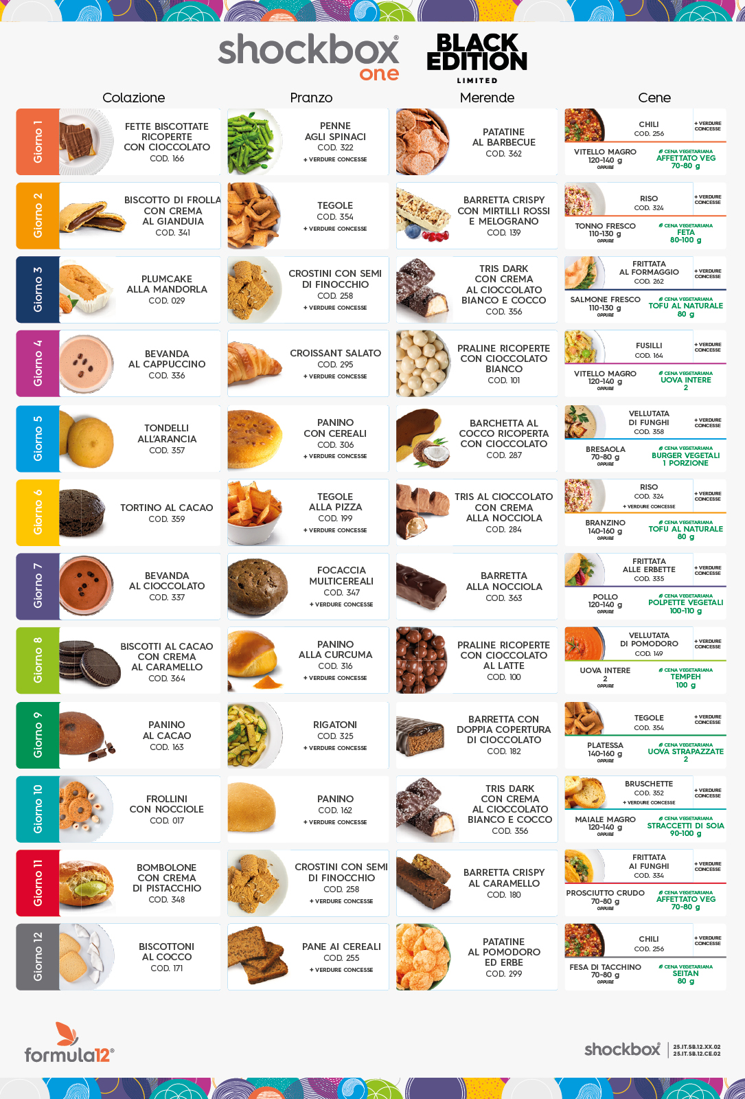 La suddivisione in comodi astucci giornalieri rende il percorso semplice da seguire, mentre il nuovo menù in edizione limitata propone i piatti più amati di Formula12, selezionati per offrirti varietà e piacere ogni giorno.
