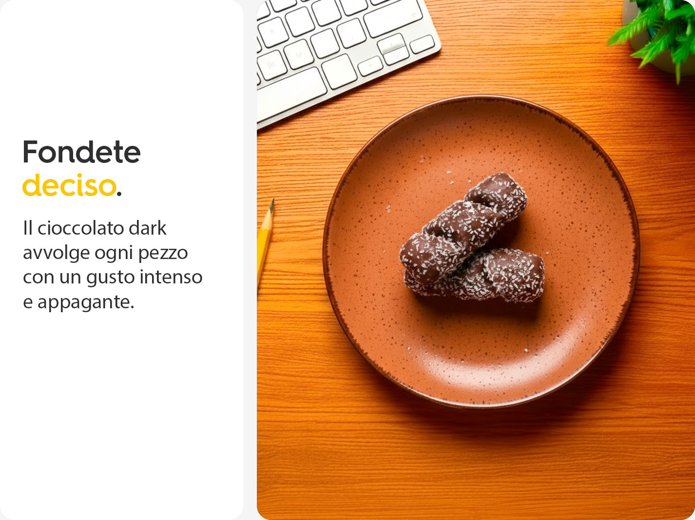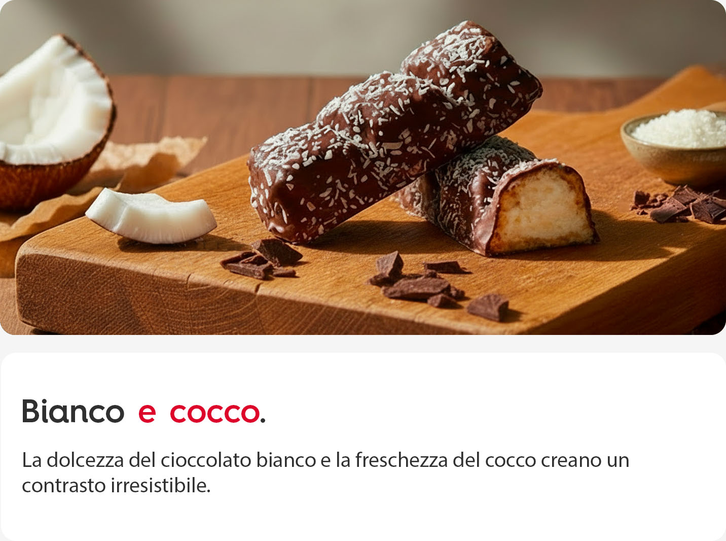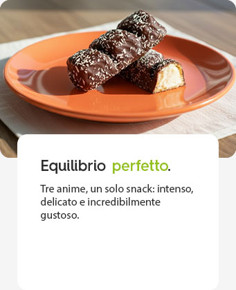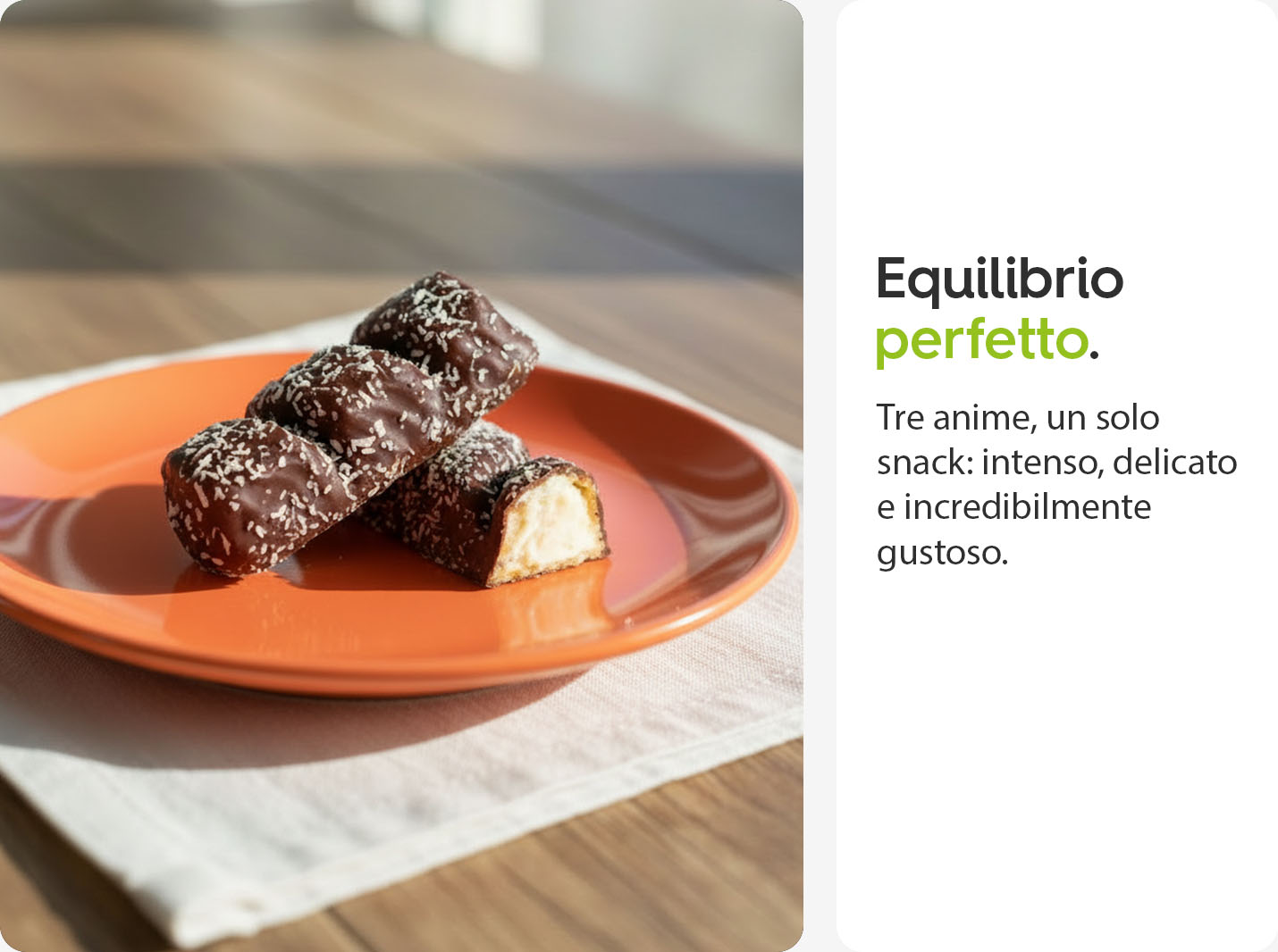 Un abbinamento sorprendente: la forza del cioccolato fondente incontra la dolcezza del cioccolato bianco e la freschezza del cocco. Il tris proteico è lo snack che conquista con equilibrio e intensità, regalando un’esperienza di gusto ricca e mai banale.