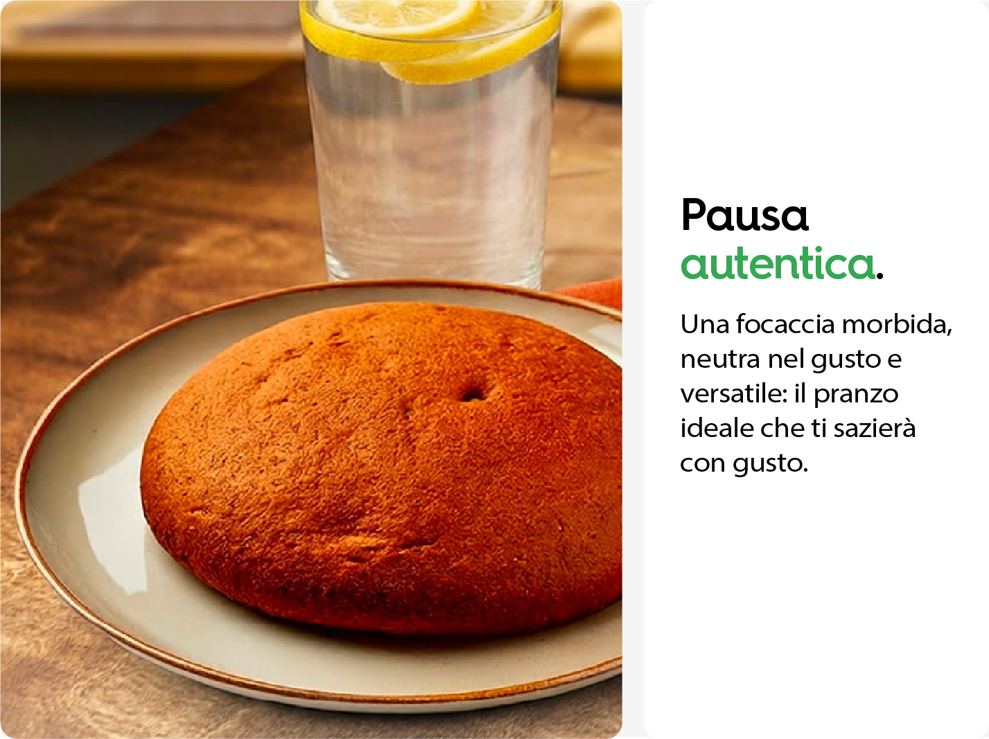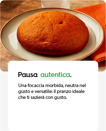 La morbidezza incontra la semplicità. Ogni morso di Focaccella è un equilibrio naturale: soffice, rotonda nel gusto e appagante, pensata per un pranzo completo nel segno della leggerezza. Versatile e delicata, si abbina facilmente a verdure o insalate.