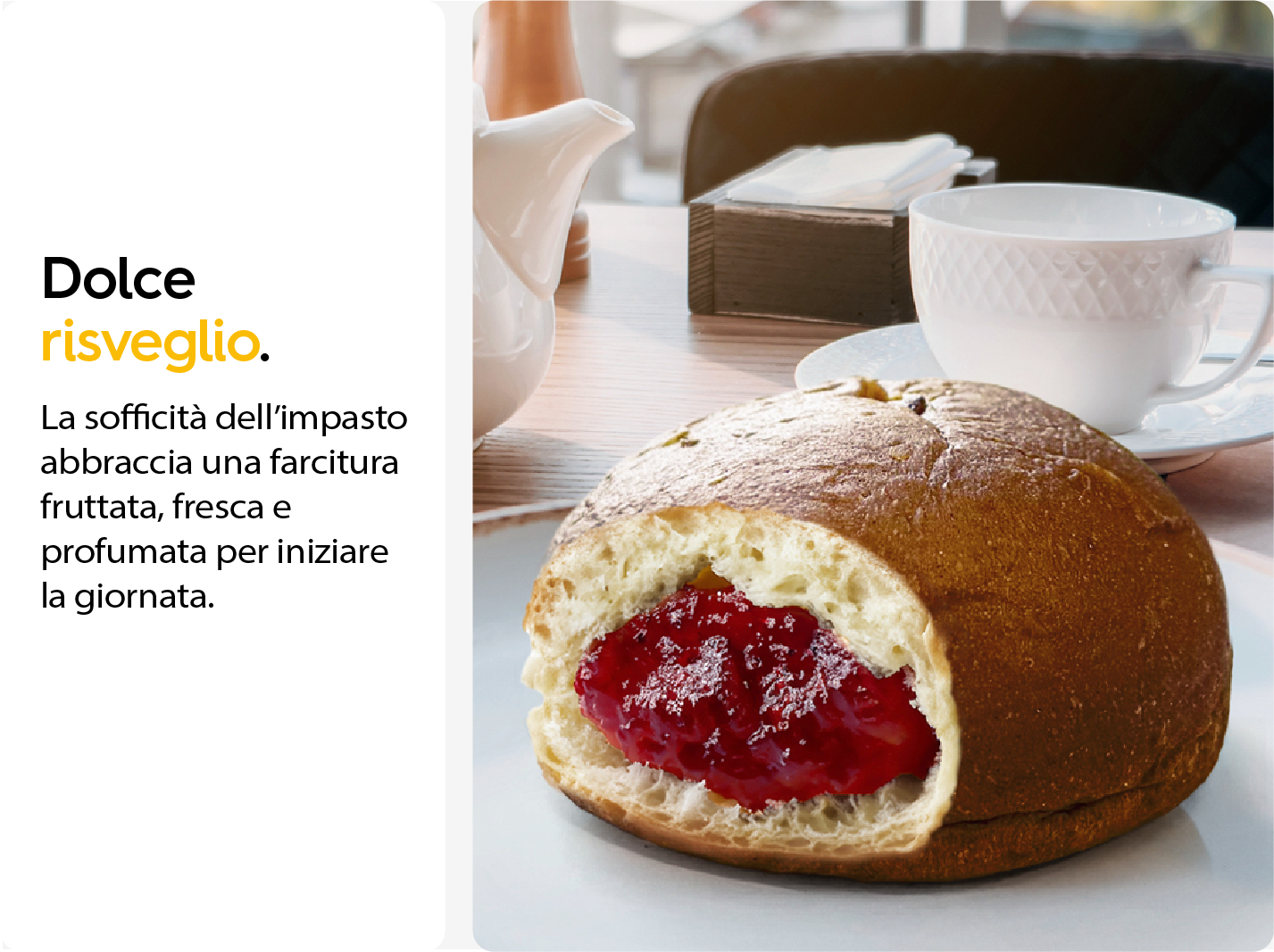 La dolcezza incontra il frutto. Ogni morso di Bombolone è un contrasto armonioso tra la sofficità dell’impasto e la vivacità dei frutti di bosco: vellutato, profumato e naturalmente goloso. Pensato per una colazione appagante, trasforma il risveglio in un momento di piacere autentico.
