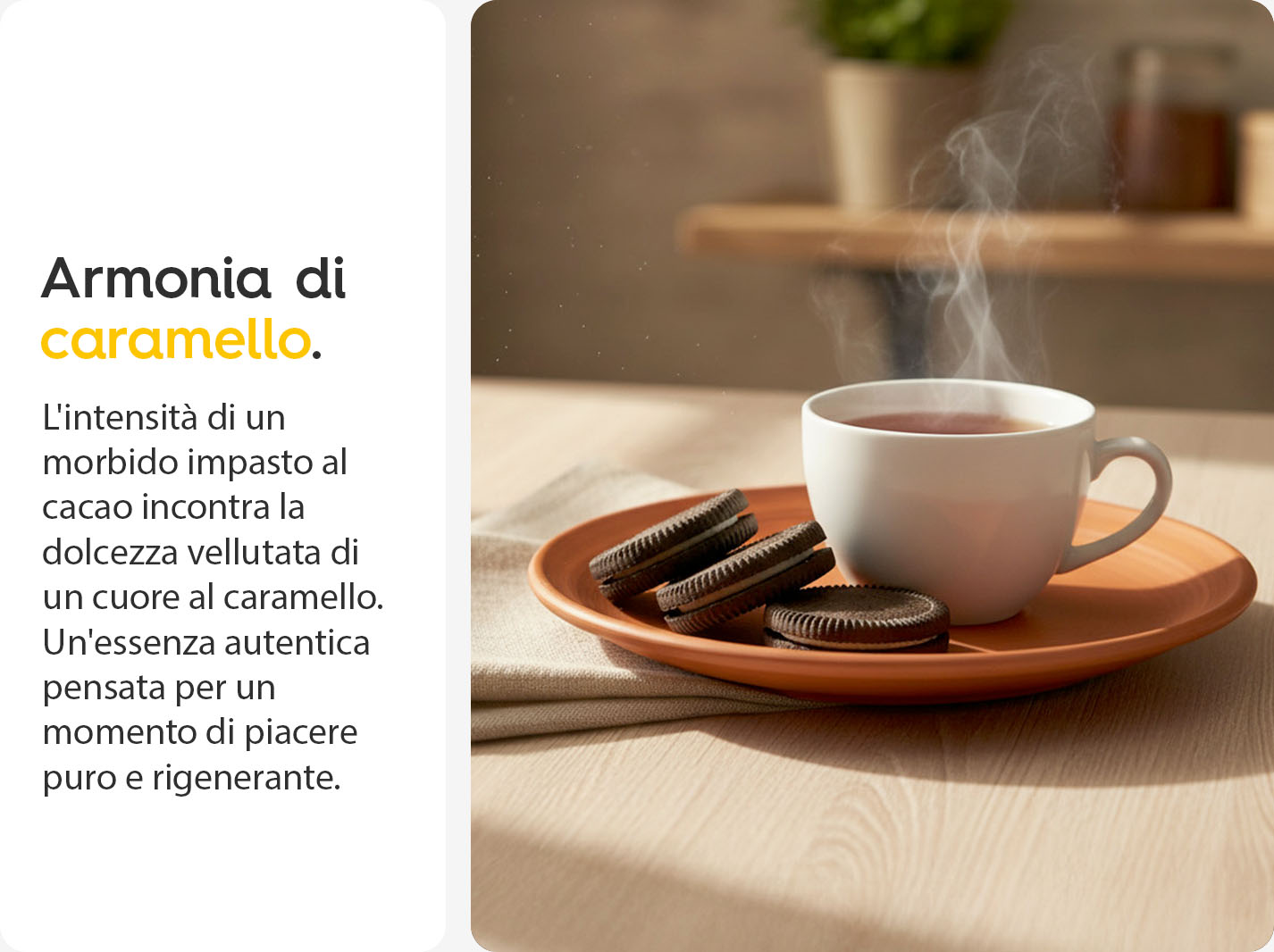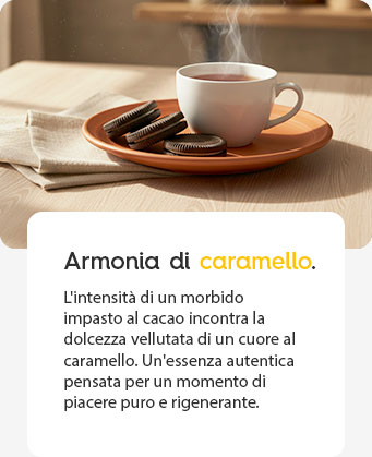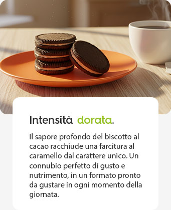 Una colazione semplice con un gusto deciso. I Biscotti al cacao con crema al caramello uniscono due strati di biscotto al cacao a una farcitura morbida e avvolgente, creando un contrasto netto tra croccante e cremoso. Pratici e subito pronti, sono pensati per iniziare la giornata con qualcosa di buono e appagante.